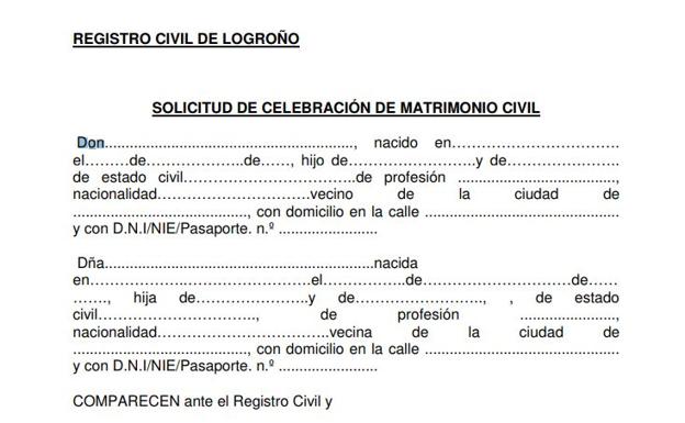 La web del Gobierno de La Rioja ofrece información sobre el Registro Civil y solicitudes de matrimonio, (http://www.larioja.org/registro-civil/es/solicitud-matrimonio) como se puede ver en la solicitud que el Gobierno ofrece (http://www.larioja.org/larioja-client/cm/registro-civil/images?idMmedia=625276) «no deja posibilidad para parejas del mismo sexo», aseguran, ya que solo se puede elegir ‘don y doña’ y no ‘doña y doña’ o don y don’, por ejemplo.